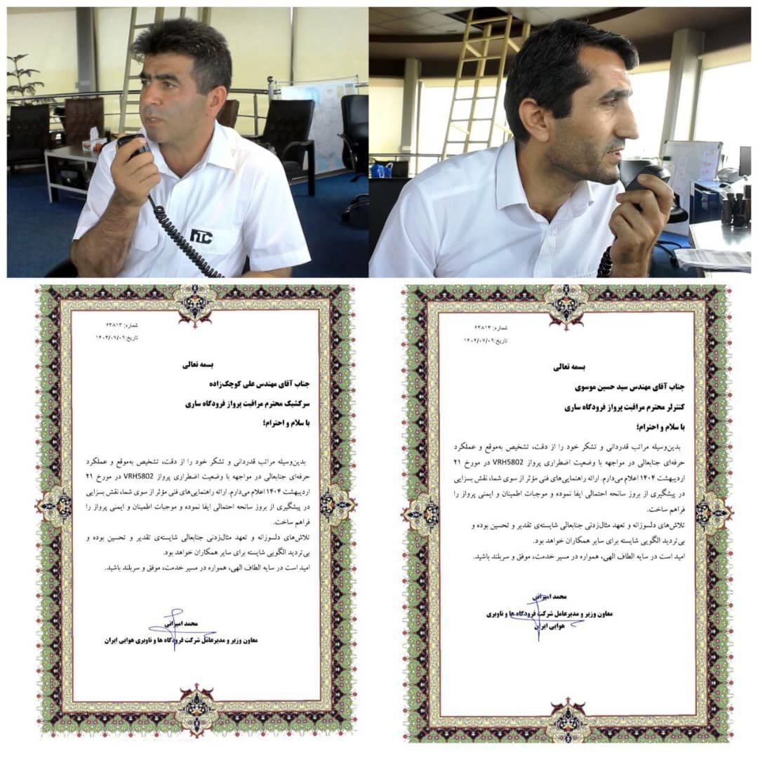 دو کنترلر مجرب برج مراقبت پرواز فرودگاه ساری، بعد از تشخیص قطع کامل سیستمهای ناوبری هواپیما، بلافاصله وارد عمل شده و با ارائه راهنماییهای فنی بسیار دقیق به خلبان، او را در شرایط بحرانی، یاری و از بروز سانحه برای ۱۴۰ مسافر جلوگیری کرند.